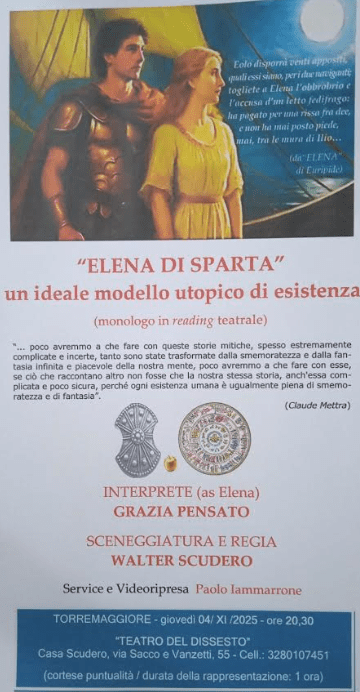 Grazia, sarai tu a farti portavoce di questa storia. Oggi ti assumerai l’impegno di reincarnare questa protagonista, raccontando ad un pubblico di cronisti del nostro tempo, la storia di Elena di Sparta, una donna che ho voluto già descrivere nel mio libro: “Quando le vicende elleniche approdavano al mito. Diciannove esempi tra i tanti possibili” (Ed. Joelle Srl, Città di Castello, giugno 2022). Così “Elena di Sparta. Un ideale modello utopico di esistenza” è il nome dell’happening di questa sera, al Teatro del Dissesto di Walter Scudero.