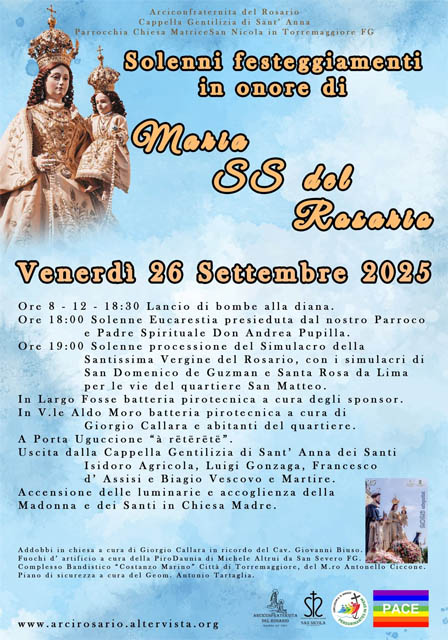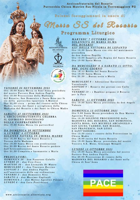 Con la prima Processione della Madonna del Rosario nel quartiere parrocchiale di San Matteo inizia la Grande Festa di Ottobre. Questa sera la Madonna con i Santi sarà accolta nella Chiesa Madre per l’ inizio del Solenne Novenario durante il quale si alterneranno ogni sera 9 sacerdoti: il cammino troverà il suo culmine nella Supplica di mezzogiorno del 7 ottobre. Tanti altri momenti di preghiera: il Rosario serale, la Compieta con il tradizionale Buonanotte a Maria e giornate dedicate ai bambini, ai giovani e alle vocazioni. I festeggiamenti popolari con la Tradizionale Processione dei Santi e momenti ricreativi nel Centro Storico sono fissati per l’ 11.12.13 ottobre.