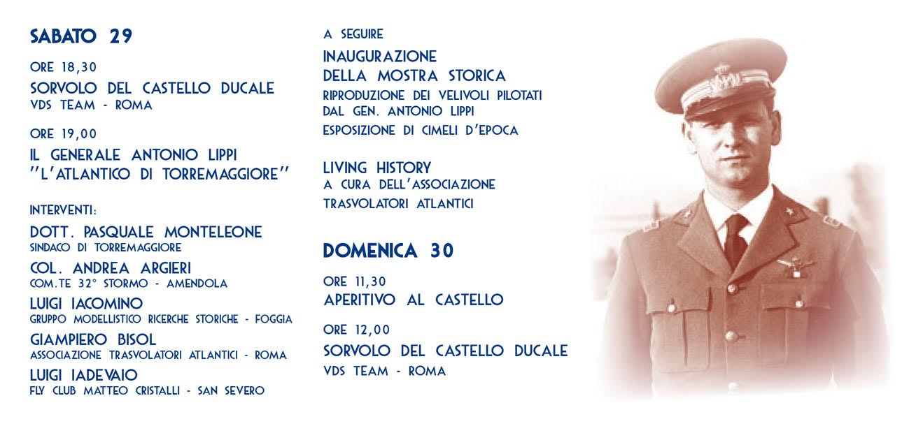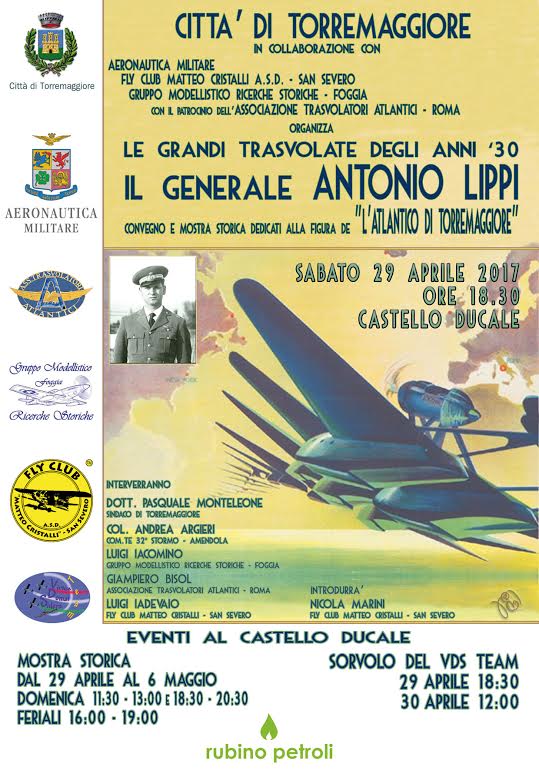 In occasione del 60° anniversario della scomparsa del Gen. Antonio Lippi – illustre concittadino, protagonista della storia dell’Aviazione italiana per la partecipazione alla prima crociera Atlantica, il Comune di Torremaggiore con la collaborazione dell’Associazione Fly Club, del Gruppo Modellistico Ricerche storiche Foggia, del 32° Stormo “Amendola”, dell’Associazione Trasvolatori Atlantici, ha realizzato un progetto commemorativo volto a celebrare la figura di questo grande aviatore attraverso una mostra tematica, che si è svolto dal 29 aprile al 6 maggio 2017. ( leggi qui la notizia) E in futuro le istituzioni locali cosa hanno intenzione di programmare per commemorare questa importante figura?