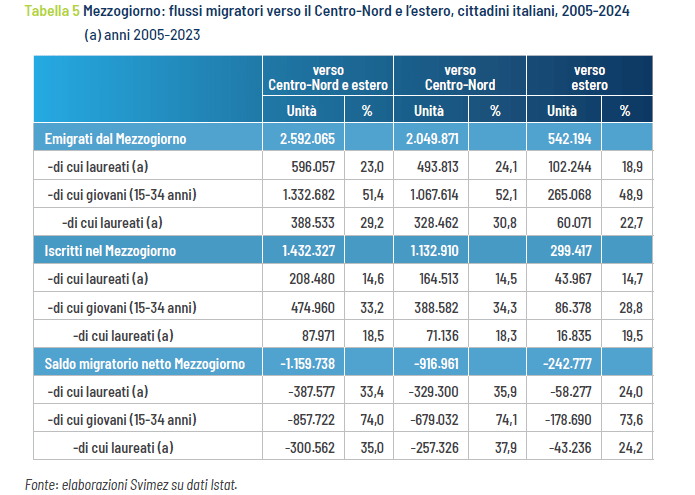COSA DICE IL RAPPORTO SVIMEZ SUI FLUSSI MIGRATORI VERSO IL CENTRO NORD E L’ESTERO – Secondo il Rapporto SVIMEZ nel ventennio 2005-2024 il Mezzogiorno ha registrato una perdita demografica di proporzioni rilevanti, segnata soprattutto dalle migrazioni verso il Centro-Nord (Tab. 5). Complessivamente, oltre 2,5 milioni di persone hanno lasciato il Sud, a fronte di circa 1,4 milioni di iscrizioni, determinando un saldo negativo di quasi 1,2 milioni di unità. La caratteristica più critica di questa emorragia è la selettività: a emigrare sono soprattutto i giovani e i più istruiti. Più della metà degli emigrati ha tra i 15 e i 34 anni, e un circa un terzo di essi possiede un titolo universitario. Questo fa sì che circa tre quarti della perdita complessiva siano imputabili alle giovani generazioni (–858mila), con una componente consistente di laureati (–301mila). Il quadro è ancora più evidente se si guarda alle destinazioni. La gran parte delle perdite nette riguarda i trasferimenti interni verso il Centro-Nord: –917mila, di cui oltre 250mila giovani laureati. Nel 2024, per il secondo anno consecutivo, il favorevole andamento della domanda di lavoro nel Mezzogiorno ha ridotto sia il pendolarismo verso il resto d’Italia sia quello all’interno delle stesse regioni meridionali. Il calo è stato marcato e uniforme, riguardando in misura simile i flussi diretti verso il Centro- Nord e quelli verso l’estero. Gli occupati residenti nel Mezzogiorno che lavorano nel Centro-Nord sono scesi a 155mila, quasi 22mila in meno rispetto al 2023 (–12,2%, a fronte del –3,6% registrato l’anno precedente). Si tratta di un risultato che riporta i livelli del pendolarismo esterno ai valori del 2008, prima dell’avvio della grande recessione.